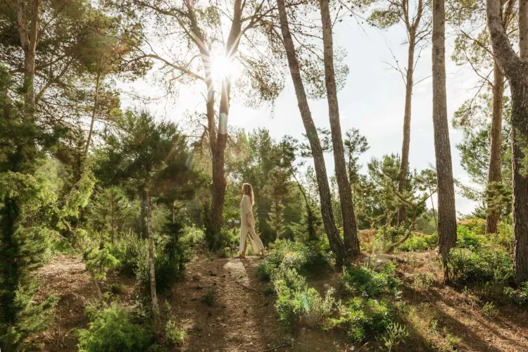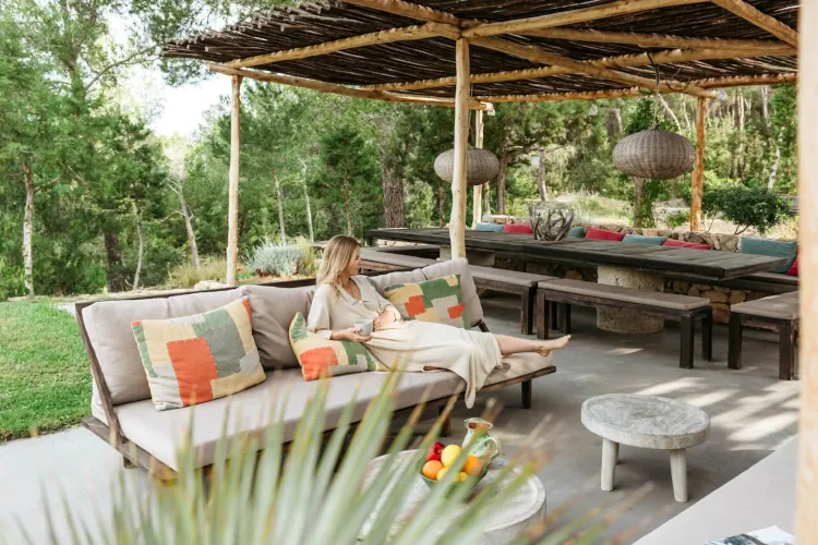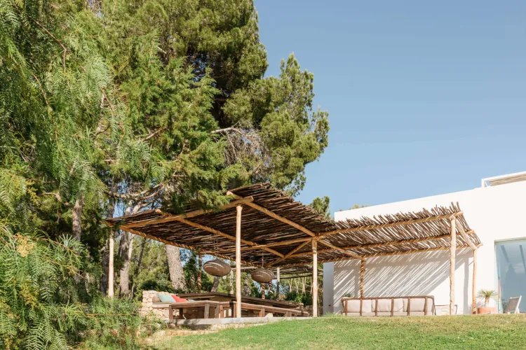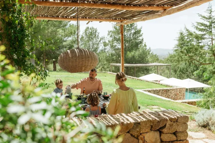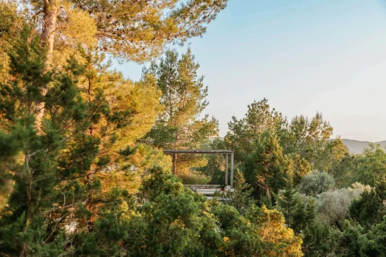For al fresco dining, a large pergola houses a handmade table seating up to twenty guests, paired with a charcoal barbecue perfect for open-fire cooking. The villa’s organic fruit and vegetable garden provides fresh seasonal produce for easy farm-to-table meals. Scattered throughout the estate are laid-back chill-out corners: hammocks beneath olive trees, a hidden forest bar for late-night gatherings, and a sunken outdoor lounge with fireplace and SONOS sound for sunset cocktails. For the best views of all, the expansive rooftop terrace becomes a front-row seat for Ibiza’s golden sunsets, or a serene yoga deck at sunrise.