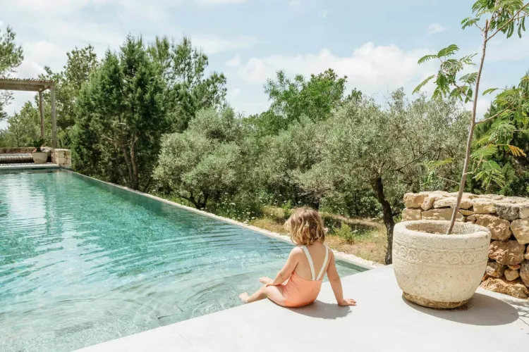 Can Zama pairs its architectural allure with an exceptional list of five-star villa amenities. Beyond the main house, a manicured lawn leads to the show-stopping 18 m infinity pool, its glassy surface blending seamlessly with the pine-fringed horizon. The heated saltwater pool is flanked by cushioned loungers, shaded daybeds, and sweeping views across the treetops of northern Ibiza — the ultimate setting for long, sun-drenched days or twilight swims.