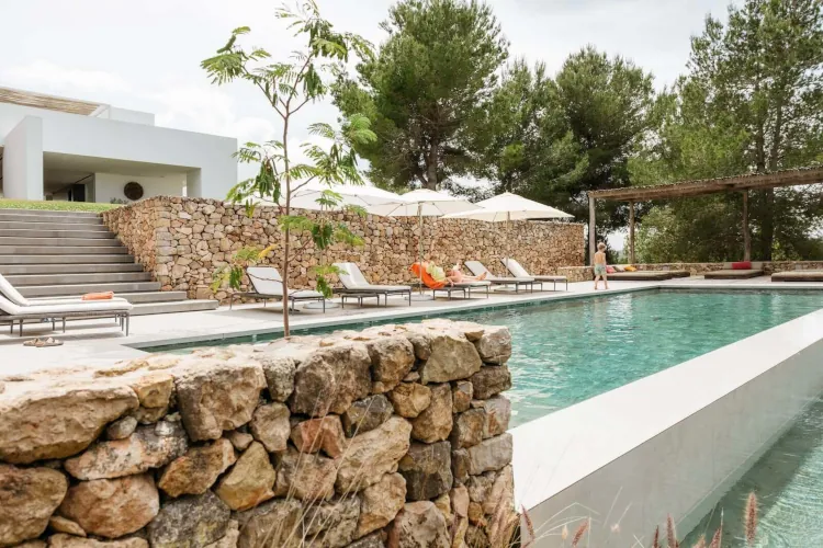 Tucked away along a rugged camino in Ibiza’s north, Can Zama is a luxury villa in North Ibiza that perfectly balances minimalist design with the island’s wild natural beauty. Designed by renowned British architect Mark Guard, this striking modern home rises from the pine-strewn hillside in a sculptural play of white walls and geometric lines.
