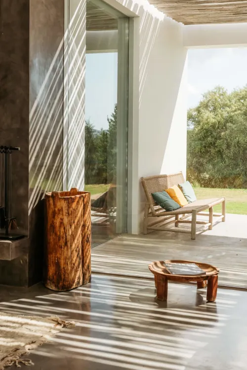 Throughout the home, micro-cement floors, bold contemporary art, and rich natural textures create a sophisticated yet soulful atmosphere. Each room features sliding glass walls that dissolve the boundary between indoor and outdoor living, leading to terraces, orchards, and landscaped gardens that stretch across six acres of private land. From its architect-designed interiors to its saltwater pool and sea-view setting, Can Zama stands among the most exclusive villas in Ibiza’s north, a masterpiece of island living.
