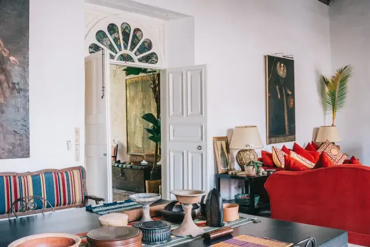 The ground floor alone boasts a trio of patio areas, a pair of shaded lounges, and a bar area with a salon. Fine art and beautiful antiques enhance the interiors throughout, all carefully selected from the owner’s collection. Outside, a long Arabian-style pond is covered in lily pads, while a large sunny garden features a big shimmering pool lined with cushioned loungers and surrounded by high walls cascading with greenery. It all adds up to a fabulously self-contained world where history, nature and art elegantly combine in laid-back grandeur.