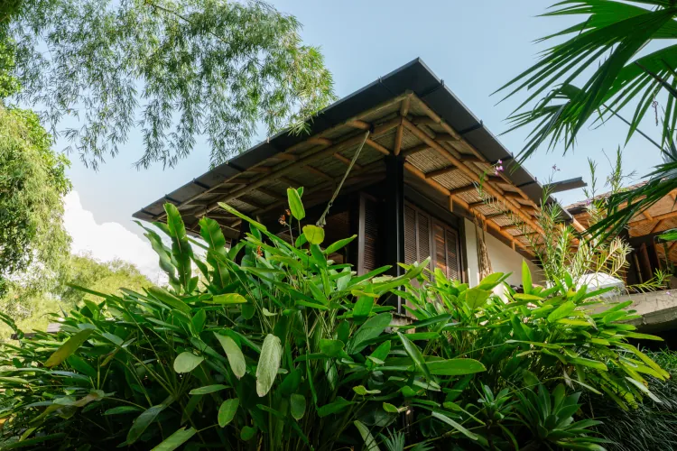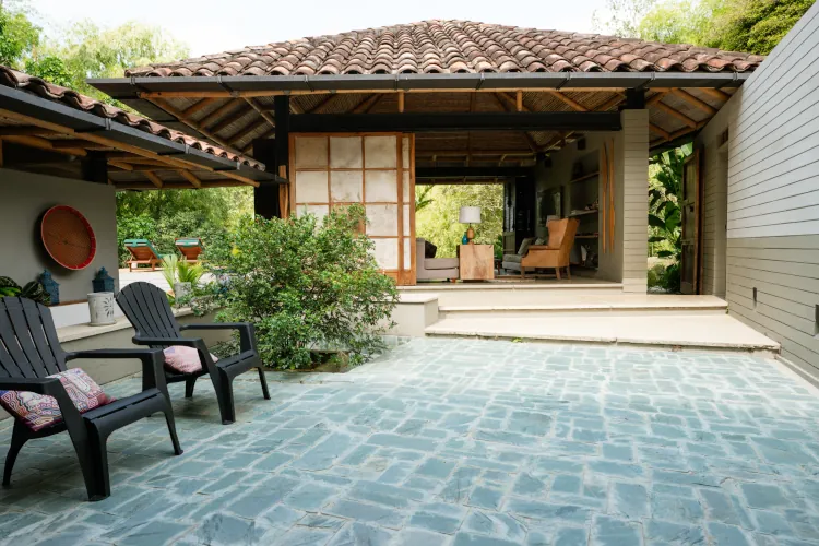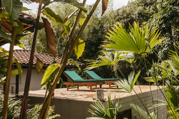 Much of Finca Quindio is built in the style of a Japanese tea house, with sliding panelled doors and bamboo ceilings, together with a number of buildings with overlapping roofs, interconnected by pretty walkways and internal patios. Simple concrete floors chime beautifully with the abundance of natural wood, cow-hide rugs and framed mirrors for an inviting, rustic vibe.