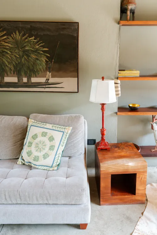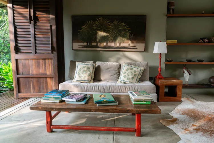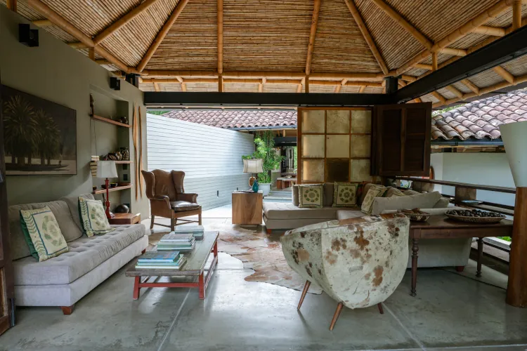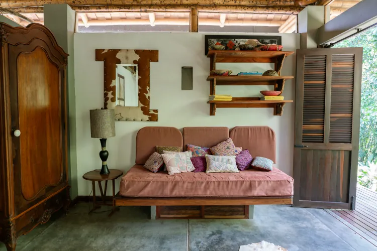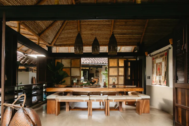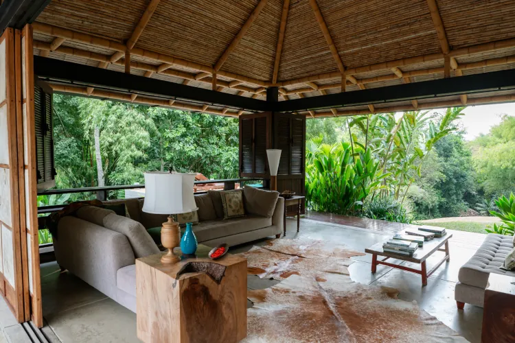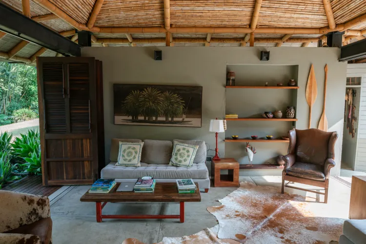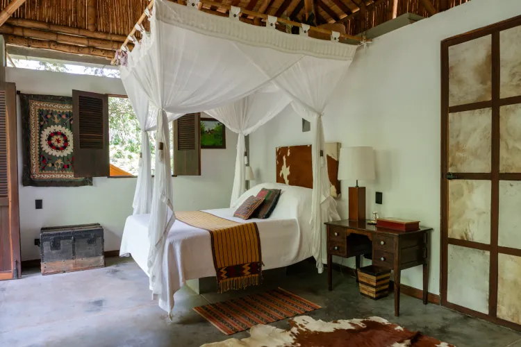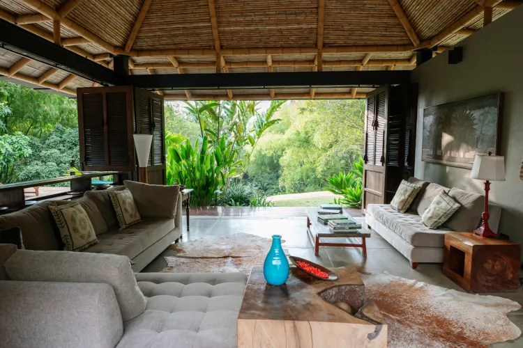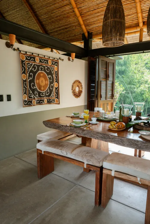 This home is all about the connection with nature and the wooden kitchen with stone floors and the adjacent dining area with its large rustic table, are both open-sided with views out over rolling lawns and forest. Ceramics are hand-painted by the owner, and wall-hung textiles and bedspreads are handwoven by Colombian indigenous artisans.