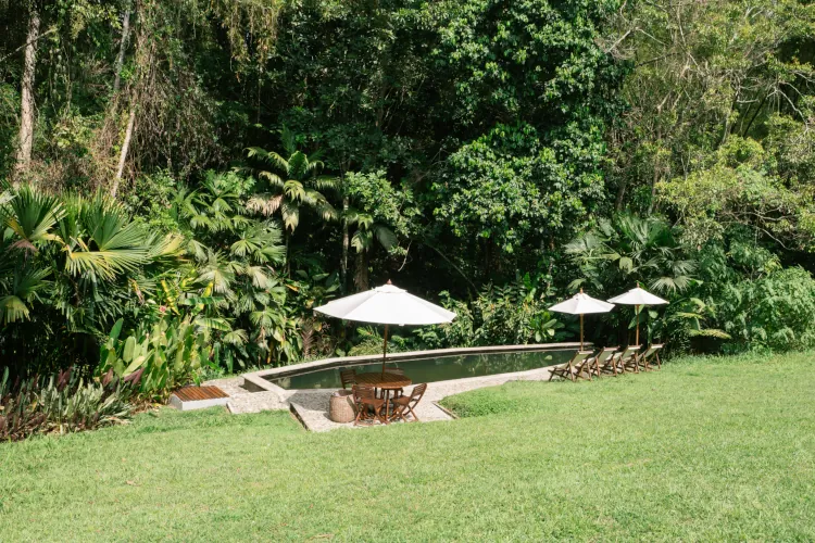 The three bedrooms in the main house all have double beds, rainfall showers and brightly coloured hammocks on private terraces looking out into the dense greenery. A fourth and very private bedroom suite is set just away from the main building.