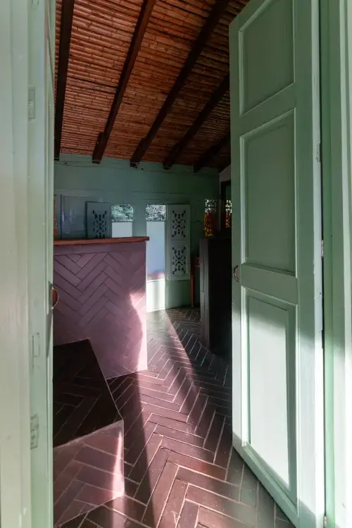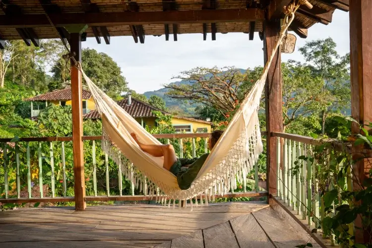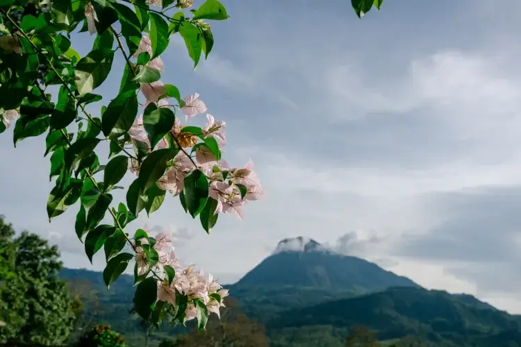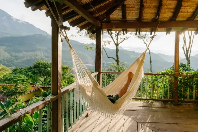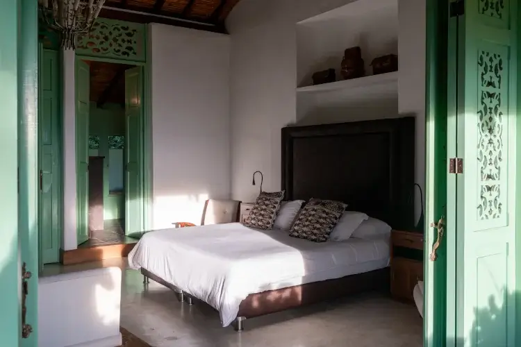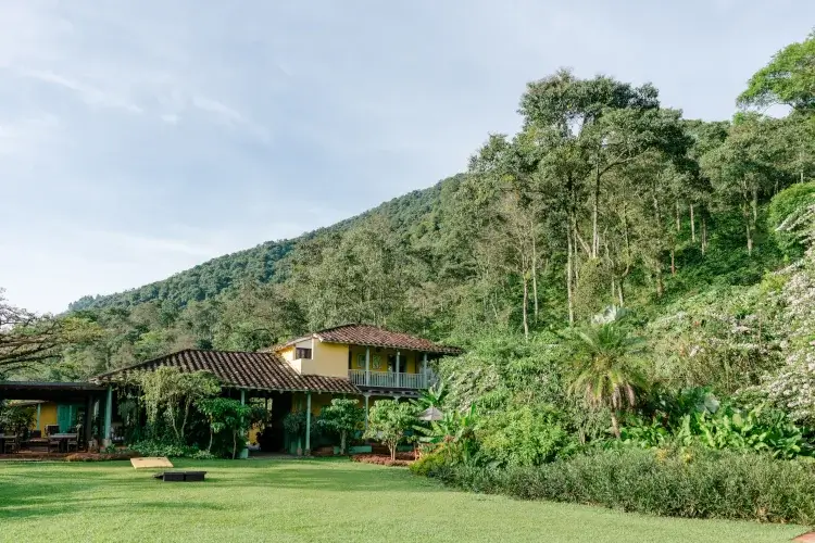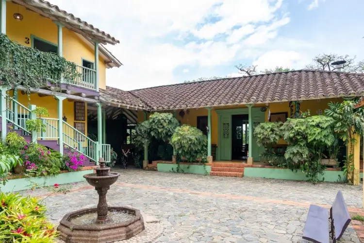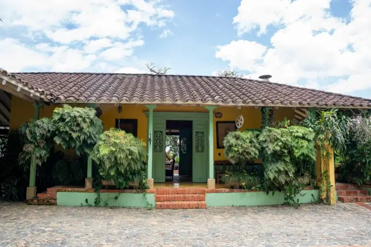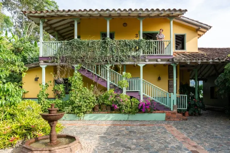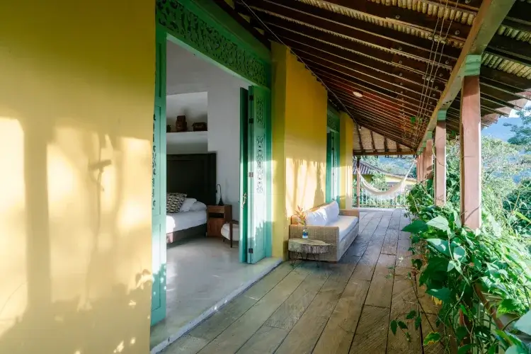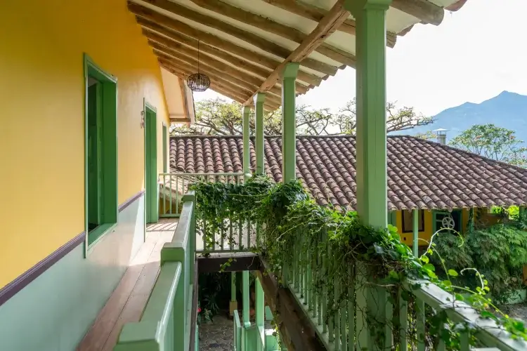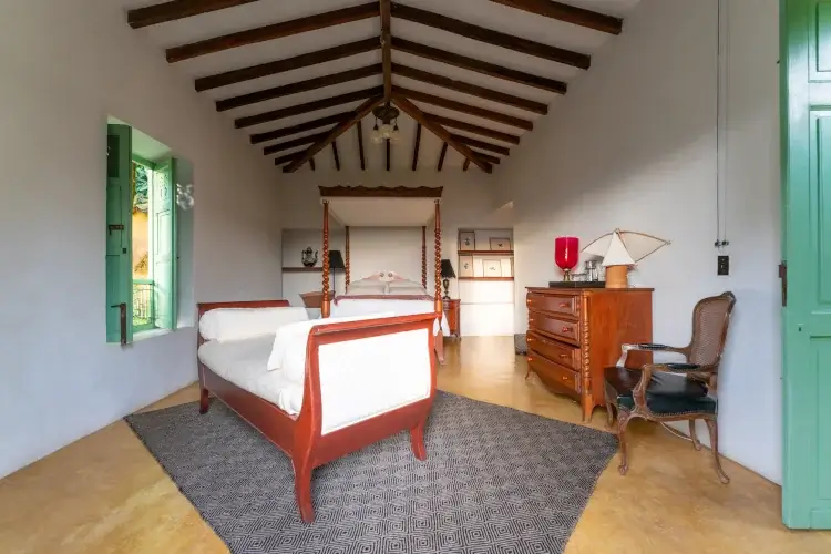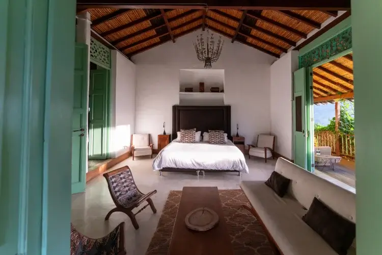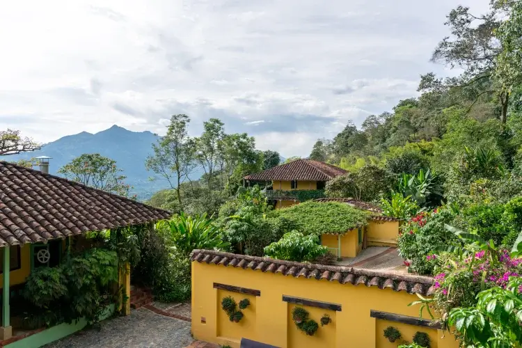 The hacienda’s central hub is its indoor/outdoor living and dining area, where guests are treated to exquisite local cuisine (all meals and provisions are included in the rental price) and a constant supply of freshly roasted coffee. An in-house cocktail bar provides the perfect setting to unwind, while a curated selection of books and board games offers screen-free entertainment for the evenings. Ten private bedroom suites are distributed across various buildings on the grounds, ensuring complete privacy for all guests. Hammocks, private terraces, and abundant outdoor seating are ideal for watching the sun set over the valleys and high mountains, as colorful birds and butterflies flit about excitedly. The hacienda meticulously preserves its traditional features, including high wooden-beamed ceilings, swing windows, and the vibrant painted style of the region. These elements are thoughtfully reimagined for modern living with luxurious furnishings, beautiful interiors, polished bathrooms, and high-quality mattresses and linens for a truly peaceful rest.