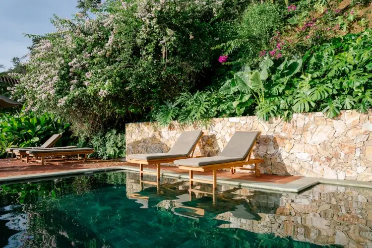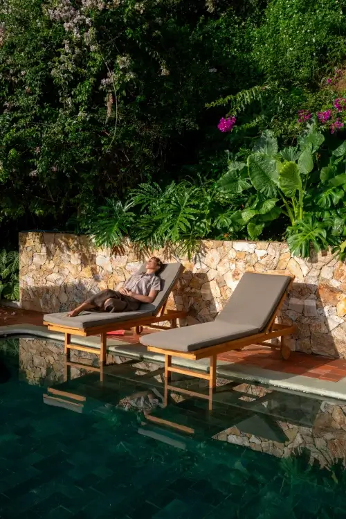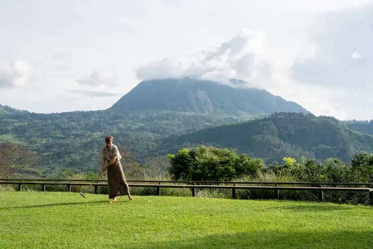 The expansive garden features two beautifully tiled pools: one perfect for leisurely laps, and another with a shallow end for relaxing, reading, or safe play for children. Both pools are adorned with sun loungers and framed by the luxuriant foliage of the mountainside, offering sweeping views across the valley to the highest peaks of the area. A second outdoor bar area serves as a versatile space, ideal for a shaded yoga platform or a therapy area for retreats and events. On the manicured lawn, guests can enjoy a game of croquet or explore the grounds, delighting in the fragrant herb and vegetable gardens or venturing into the coffee plantations. A comprehensive coffee tour is, of course, included as standard.