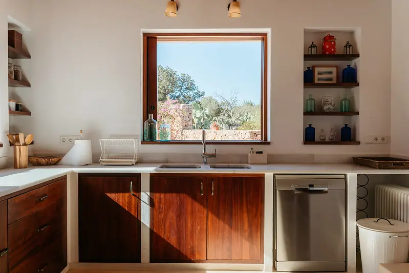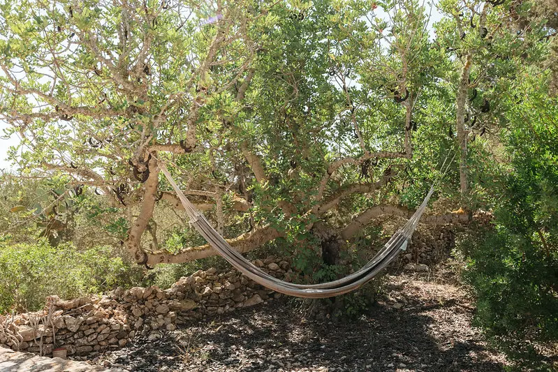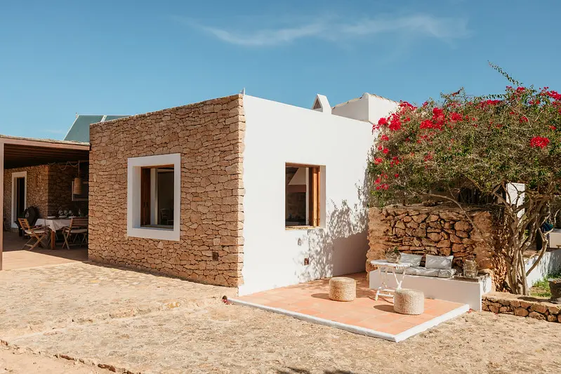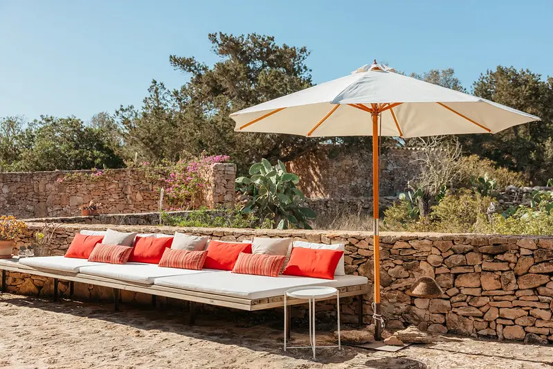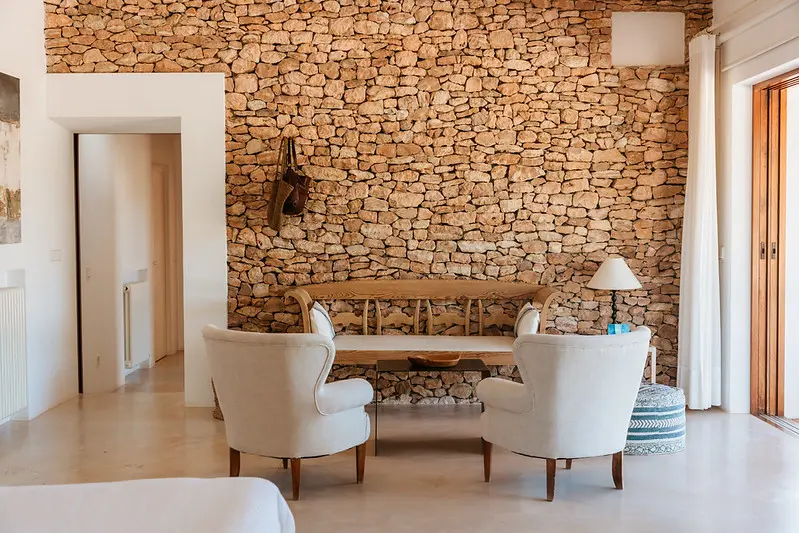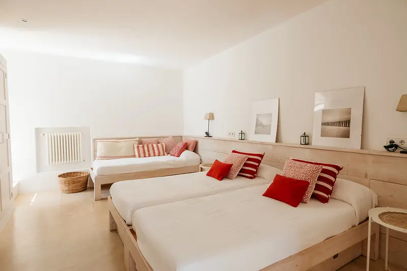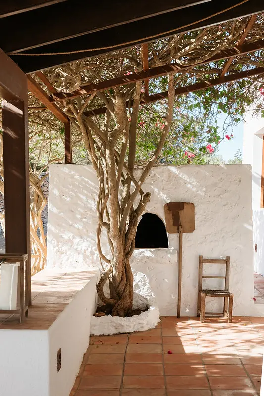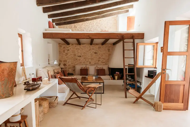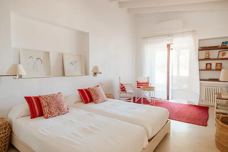 The property is built across one light-filled, spacious floor, achieving a seamless flow between the indoors and the numerous outdoor living spaces, porches, and private terraces. The oldest part of the farmhouse features a cozy living room with comfortable sofas and a mezzanine daybed. The well-equipped kitchen has marble worktops and a small breakfast bar, complete with all necessary tableware for long alfresco summer meals. A large indoor dining room, situated in the centre of the house, can seat all guests. Sunlight filters into the interior patio through shady sails, where a staircase leads up to the rooftop terrace. All four air-conditioned bedrooms feature a private bathroom and direct access to outdoor terraces.