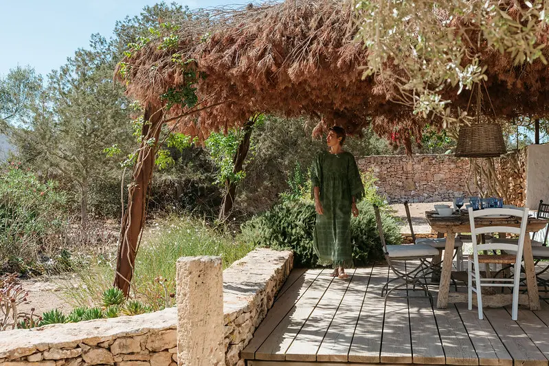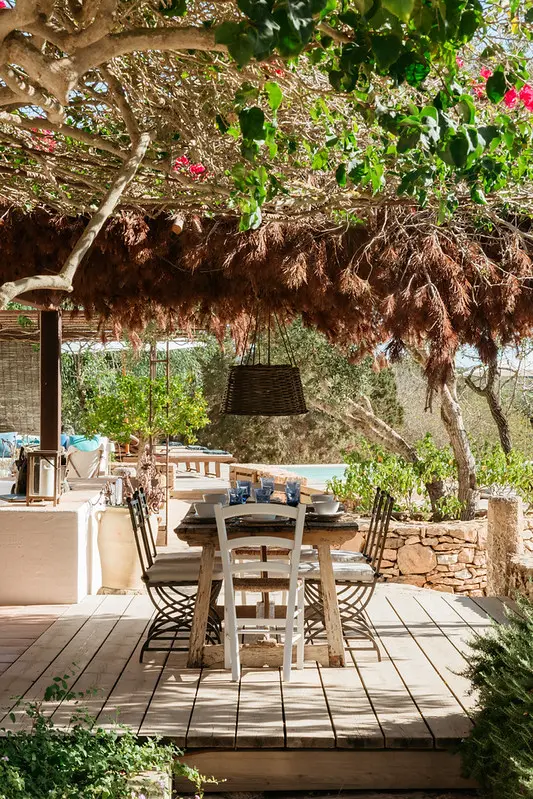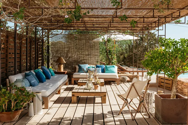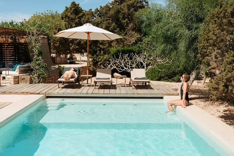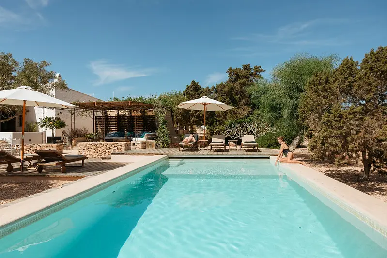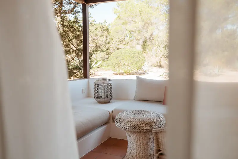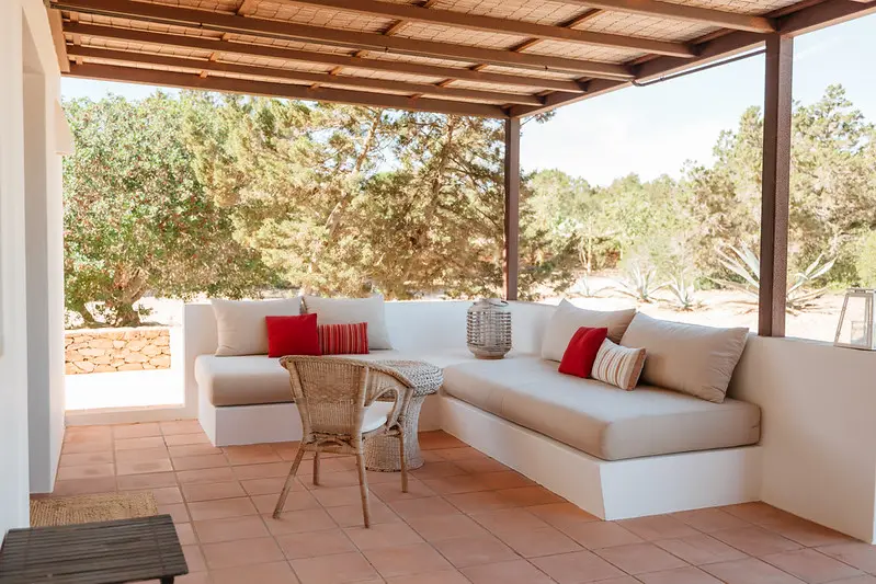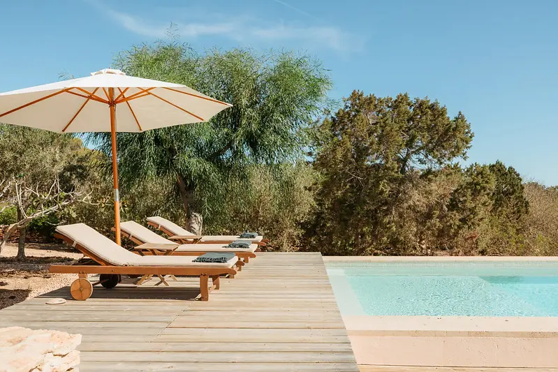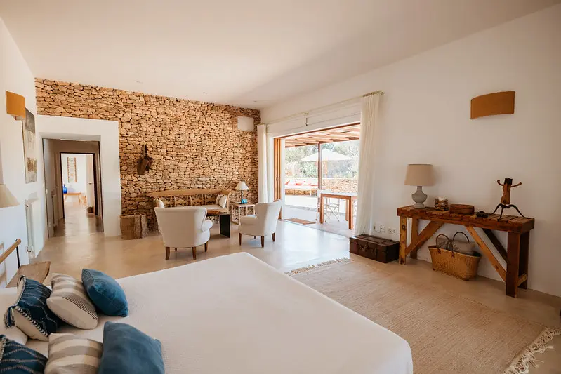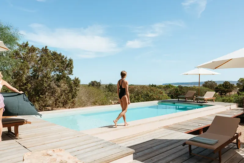 Outdoors, guests can relax on two exterior dining porches, various lounge areas furnished with comfortable seating and cushions, and a covered living terrace. The 40m² pool is set into a wooden deck, surrounded by loungers for sunbathing, and offers stunning views stretching across the bay to La Mola, and out to the sea over the south coast of Formentera.
