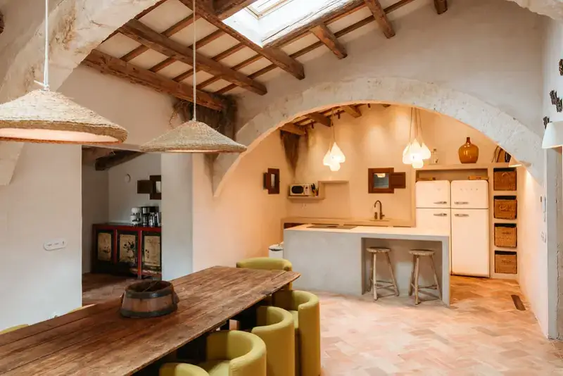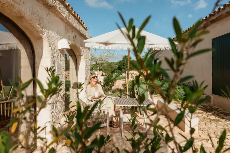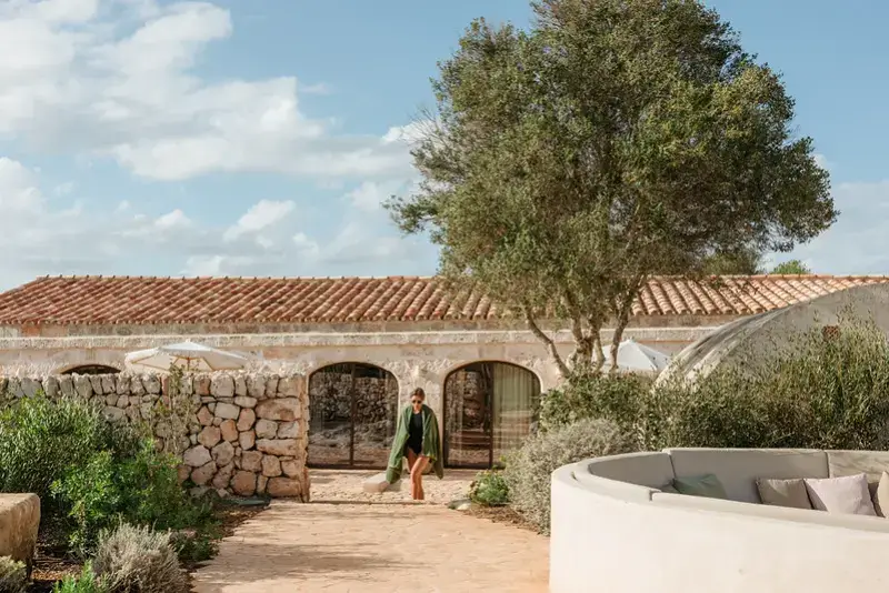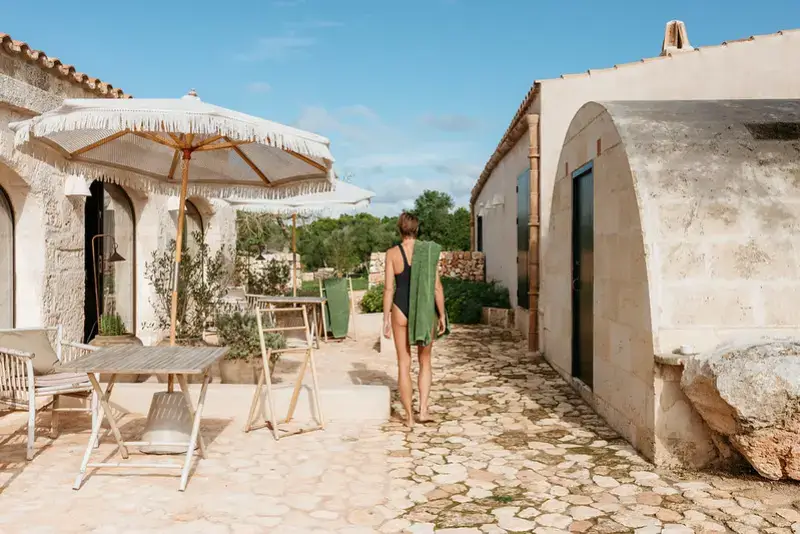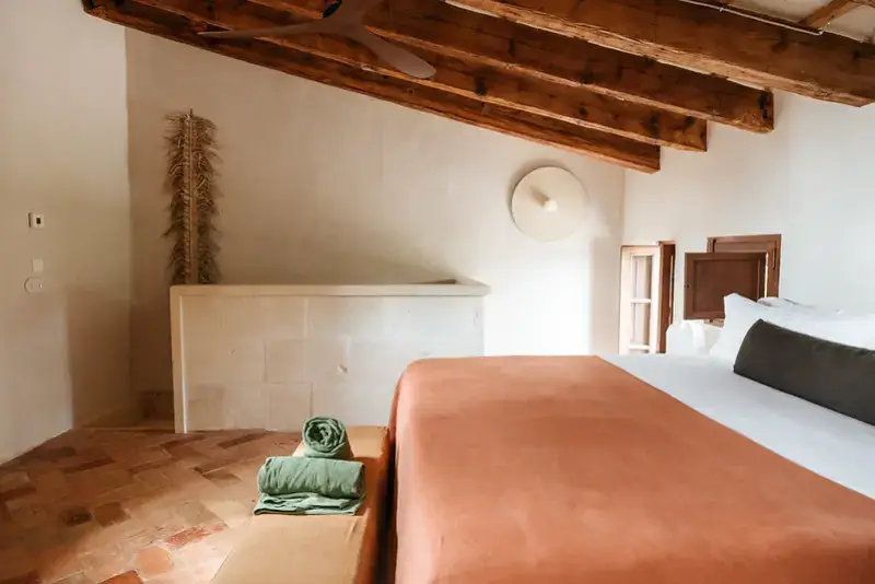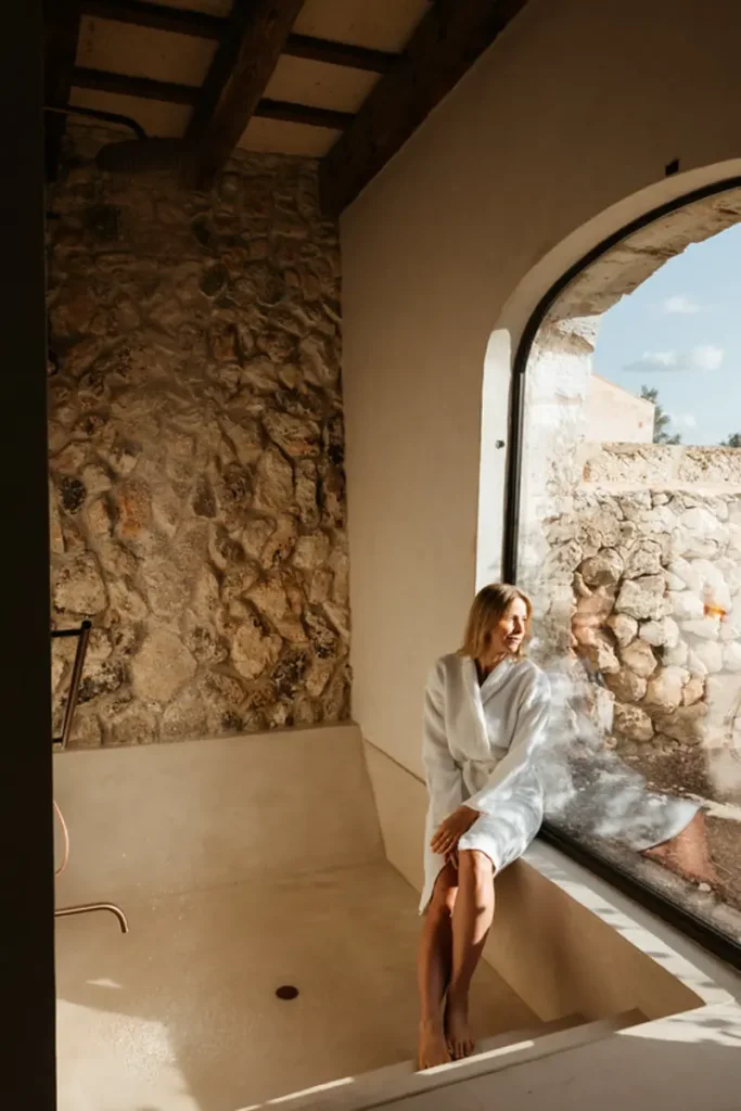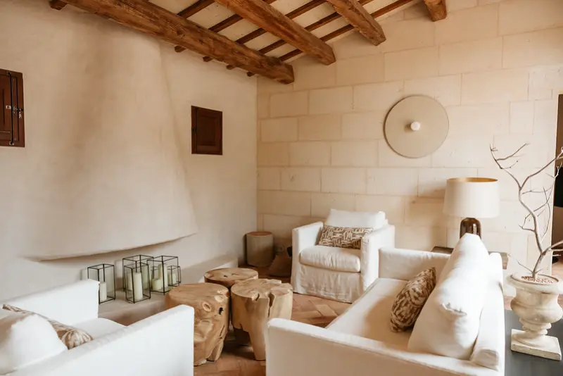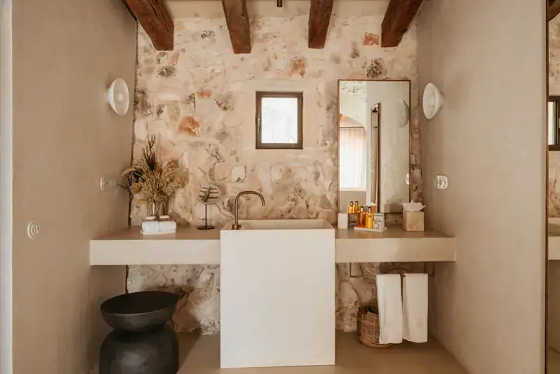 The estate features six generously proportioned bedroom suites, each offering guests a private terrace, thoughtful design, and high-end details. Five of these suites are situated in the old granary and barn buildings outside the main house, while a double bedroom suite under a wooden beamed ceiling is located on the first floor of the main house. Each room in the grounds includes a furnished sun terrace, integrated bathroom, and provides yoga mats.