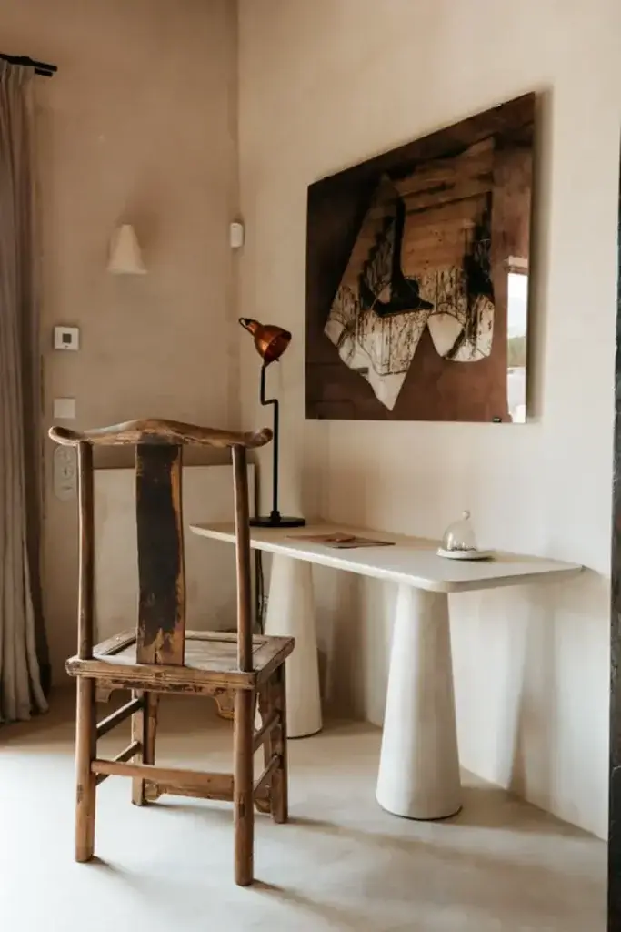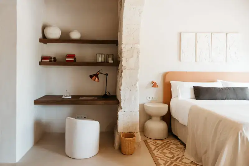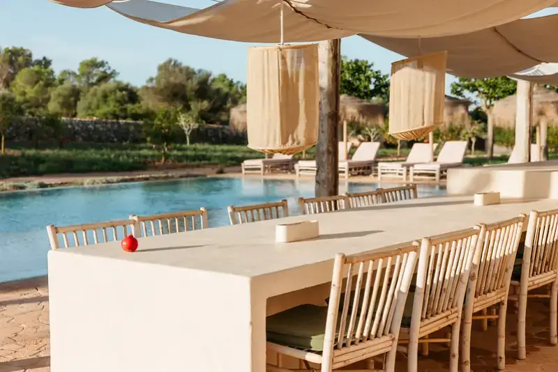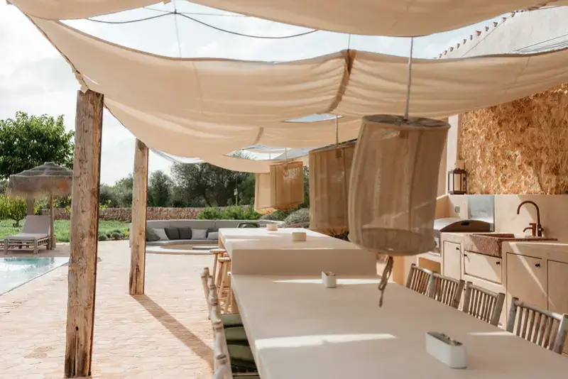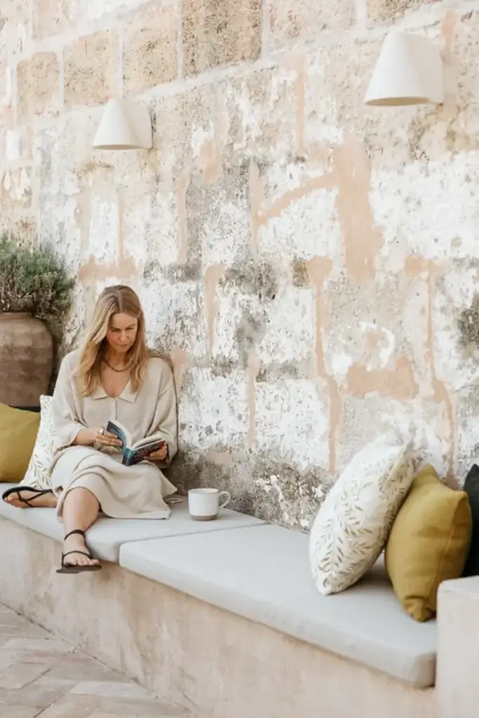The main house also includes a state-of-the-art kitchen and indoor dining area, a cozy living area, and a reading room. These spaces are furnished with a blend of antique and contemporary pieces and soft furnishings of jute, raffia and linen, all set within understated natural interiors.