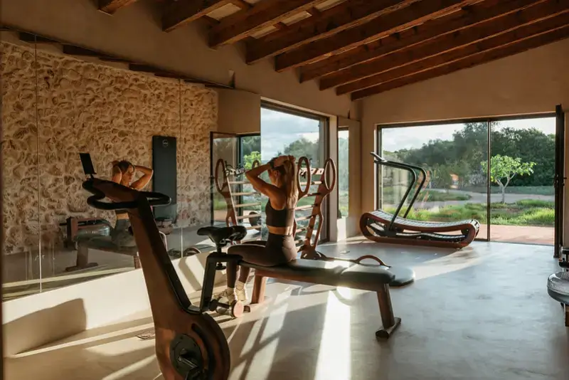 Outside, the extensive grounds are home to a multitude of lounging areas, communal spaces, and wellness areas. A 16m x 9m heated pool overlooks agricultural terraces filled with fruit trees. The garden kitchen provides one of numerous dining areas, and a firepit with seating ensures cozy evenings under the stars. For wellness, a huge wooden yoga deck shaded by pines offers ample space, complementing the professionally equipped gym that would impress any athlete.