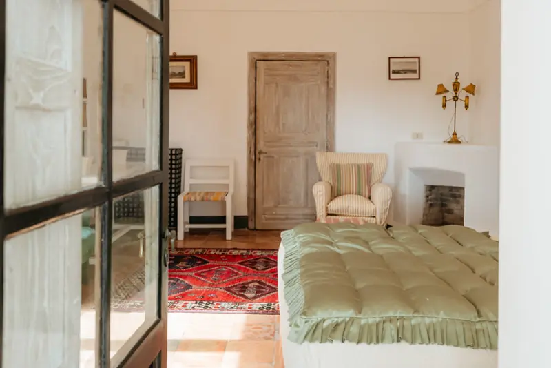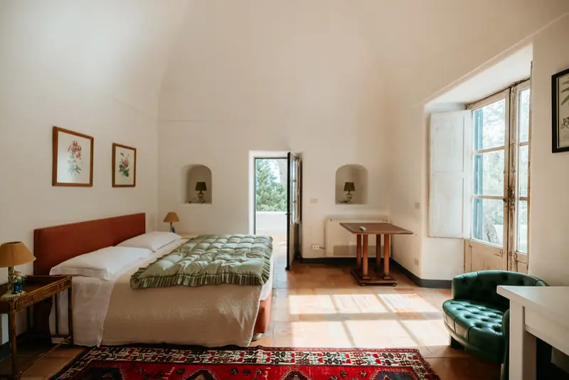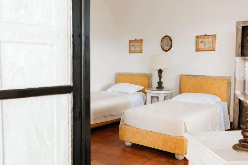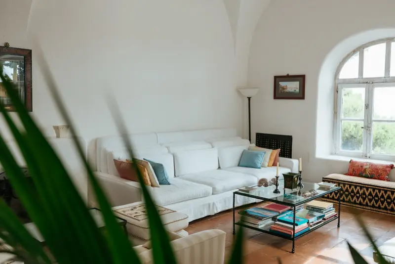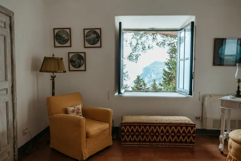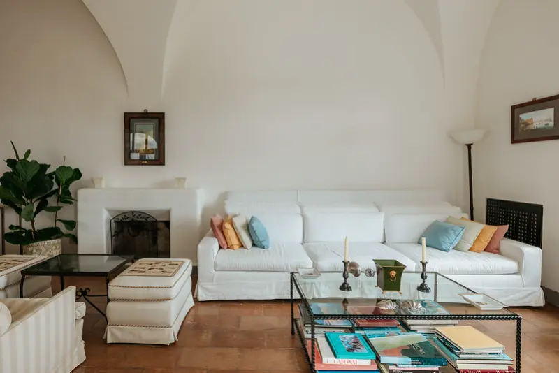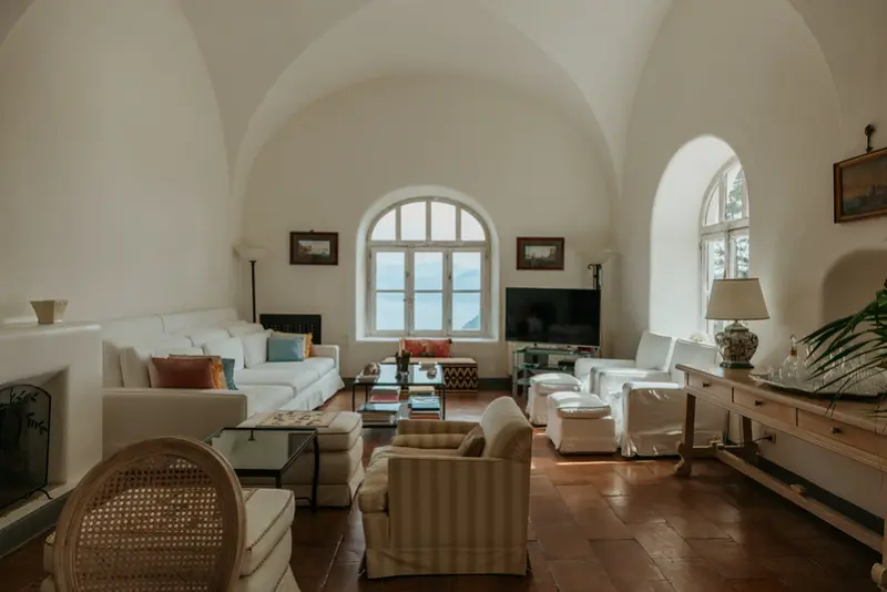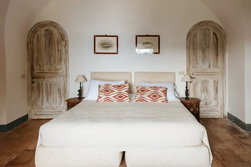 The villa’s six tasteful bedroom suites are distributed between the main house and a separate guest house, which features its own kitchenette, living area, and private terrace. The bed configurations include one king, one queen, three doubles, and one twin. Throughout the interiors, you will find a sophisticated blend of fine Italian marble in the beautifully tiled bathrooms, alongside curated antiquities, artwork, and sumptuous textiles. The spacious living room, with its lofty ceilings, is a cool and calming haven for relaxation after a day of sun. Meals can be prepared in the large main kitchen, stocked with gorgeous ceramics, or in the secondary outdoor kitchen, ensuring that the breathtaking views are enjoyed during every moment of your stay.