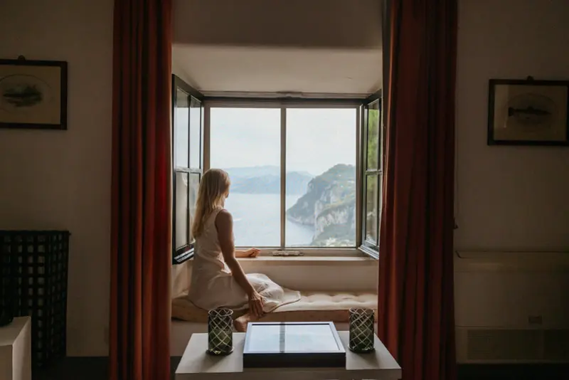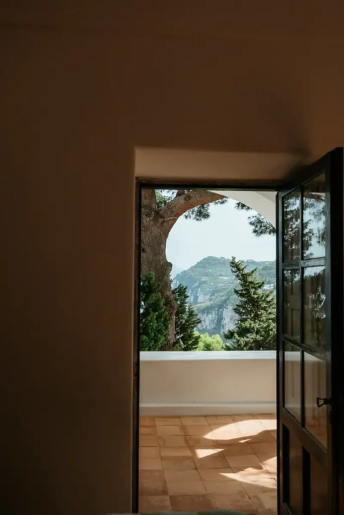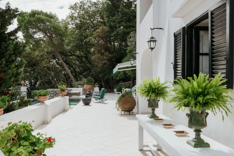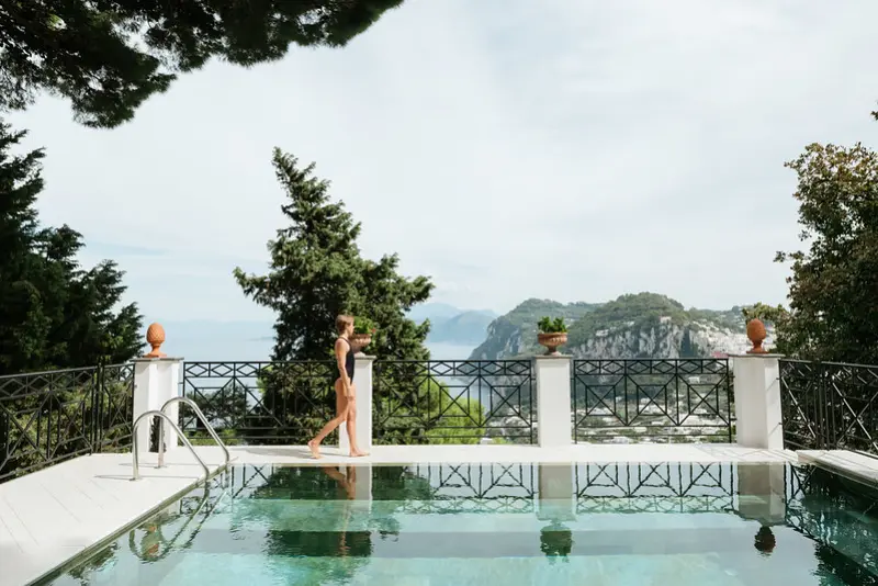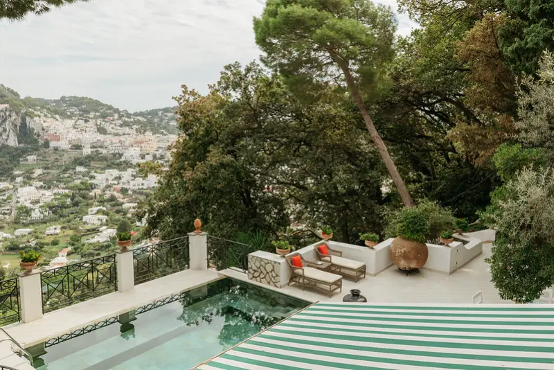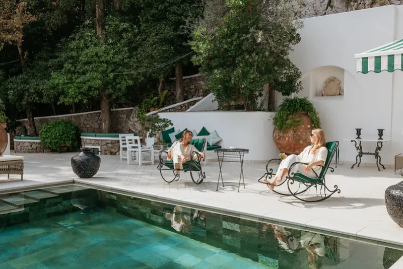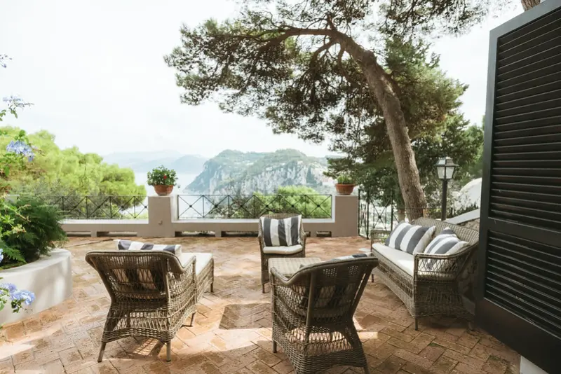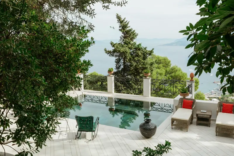 The gardens are a sensory delight, filled with the fragrant scents of bougainvillea, basil, rosemary, roses, and jasmine. The swimming pool area is furnished with comfortable lounging chairs and a shaded seating space, from which guests can marvel at the expansive vistas stretching all the way to Mount Vesuvius. For effortless access, a private funicular transports guests down the hillside to the road, leading directly into the center of Capri just a few minutes away on foot. A short taxi ride will take you to Marina Piccola, renowned for its chic beach clubs and azure swimming waters.