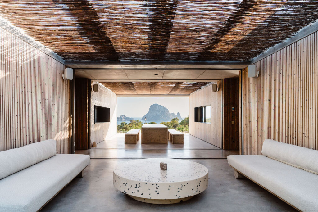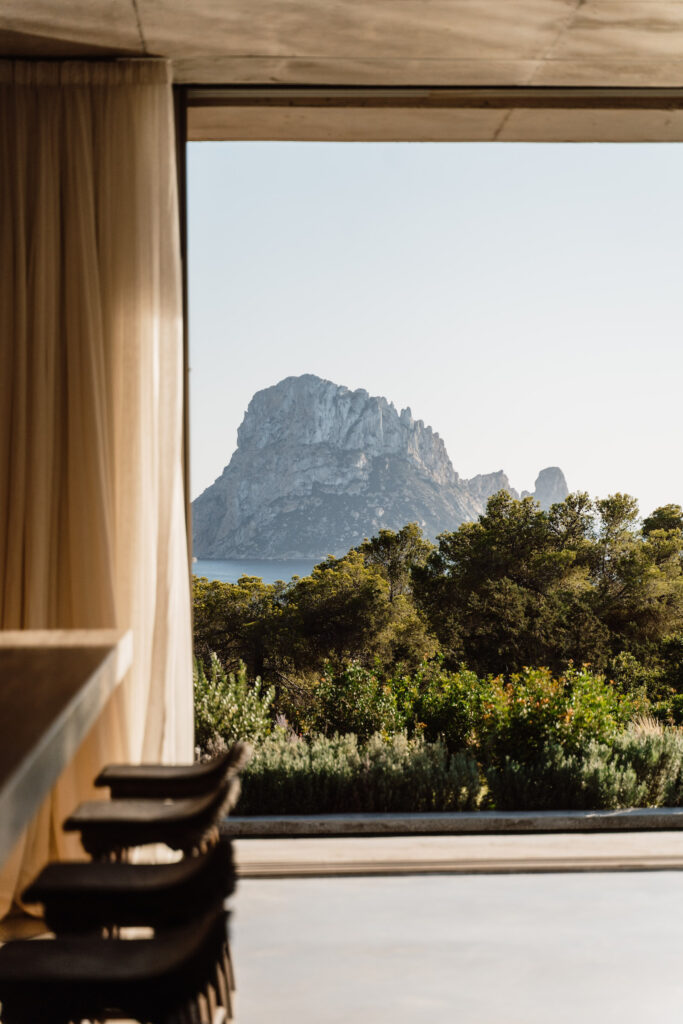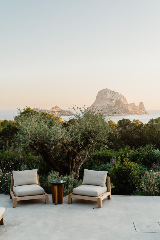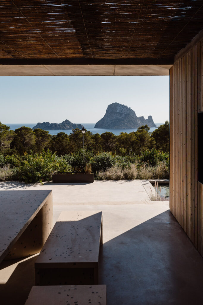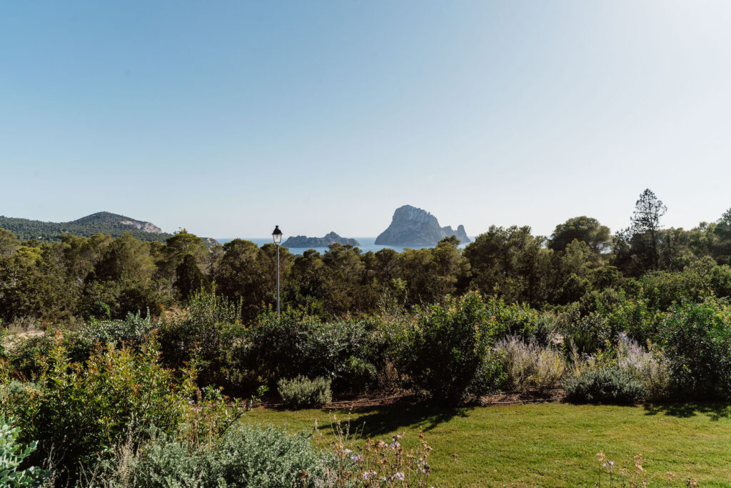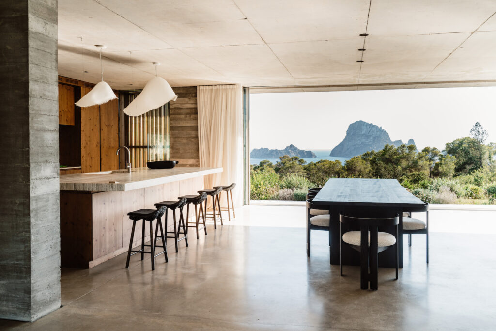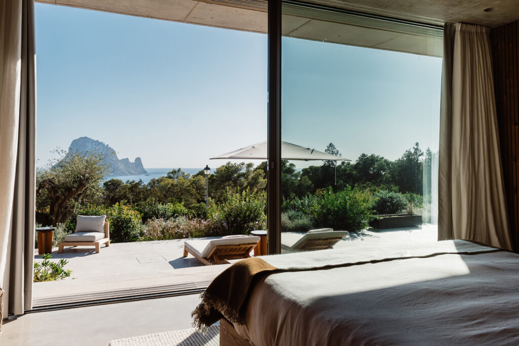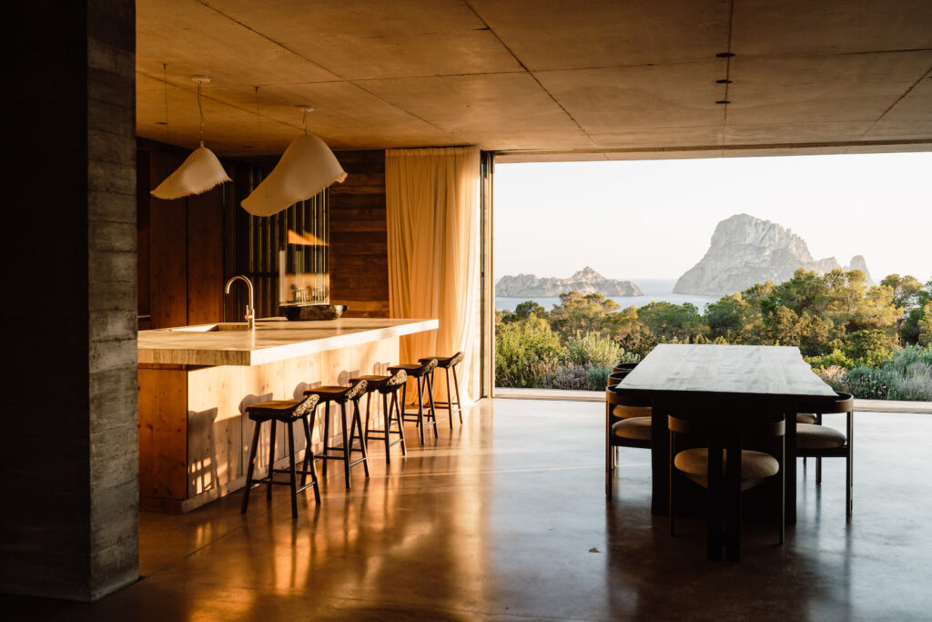 On entering the property, guests are welcomed into the main living area with floor to ceiling windows which showcase unparalleled views over the Mediterranean gardens to open sea views and the mythical Es Vedra. Natural colours of stone and wood, create a cool, calming ambience and chic, sumptuous furniture makes a cosy space. Off the living area is a functional study for those needing to stay connected while away and a cinema room. High speed internet comes as standard, of course. The kitchen is fitted with SMEG appliances and opens out onto a large shaded dining area that overlooks the pool.