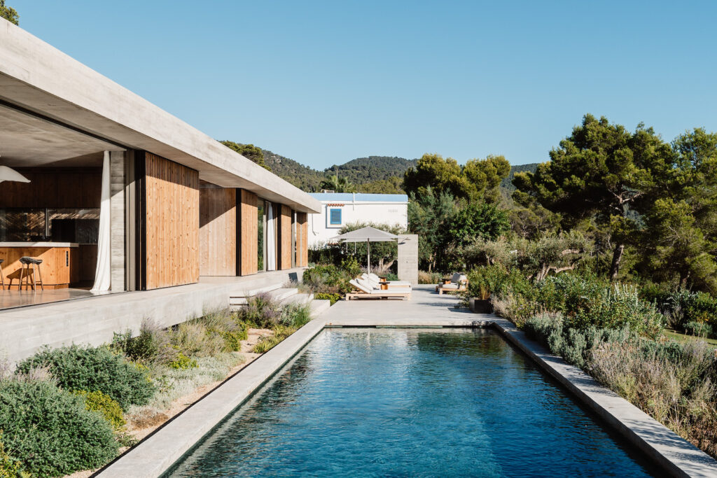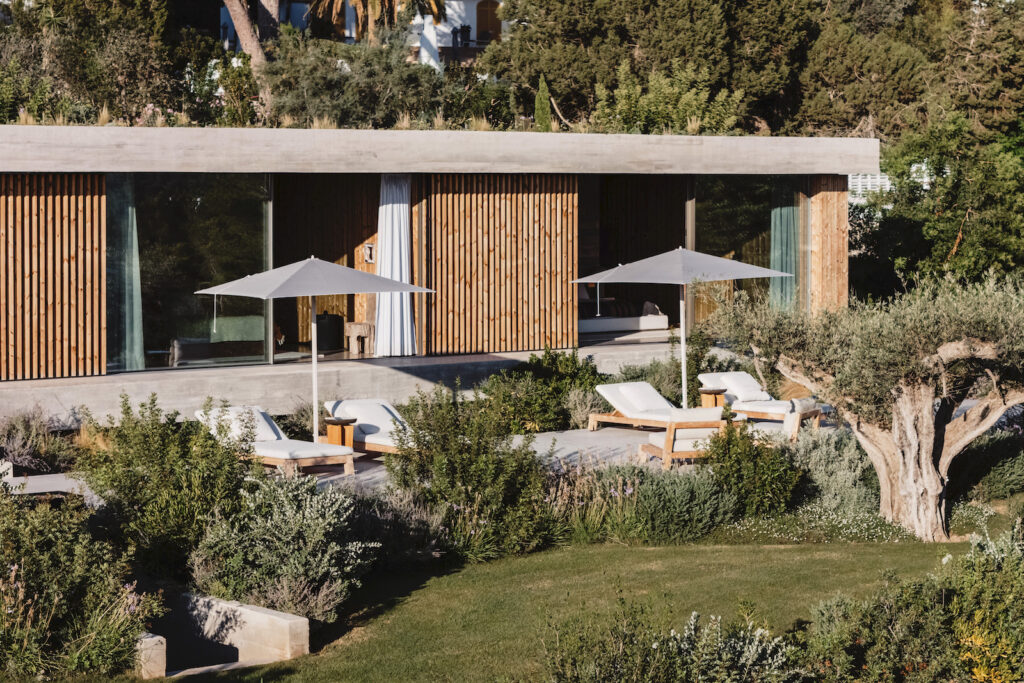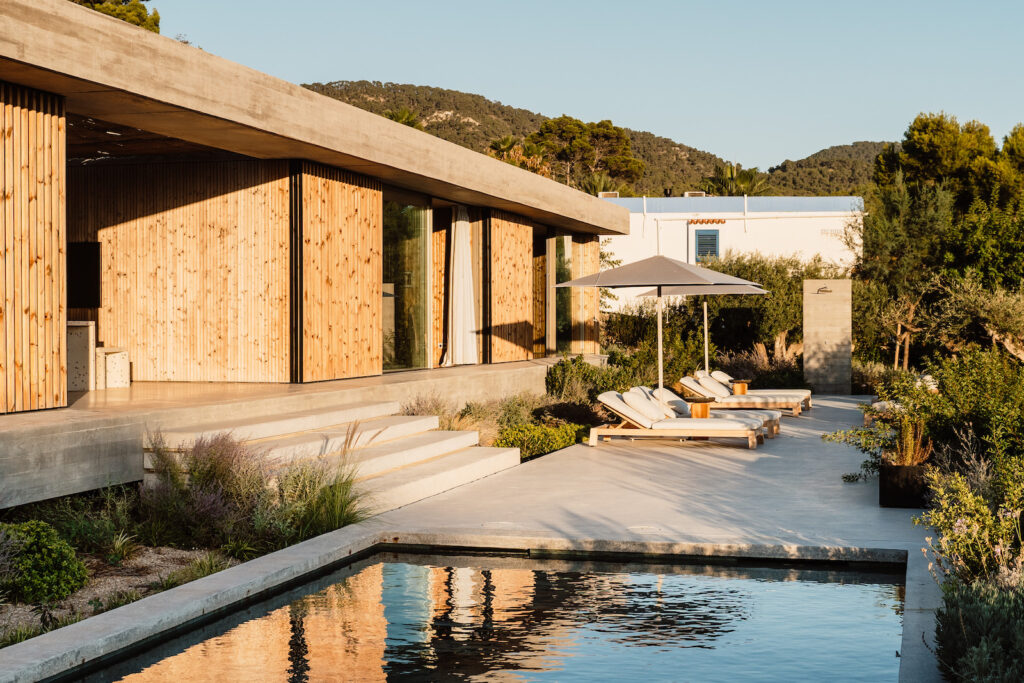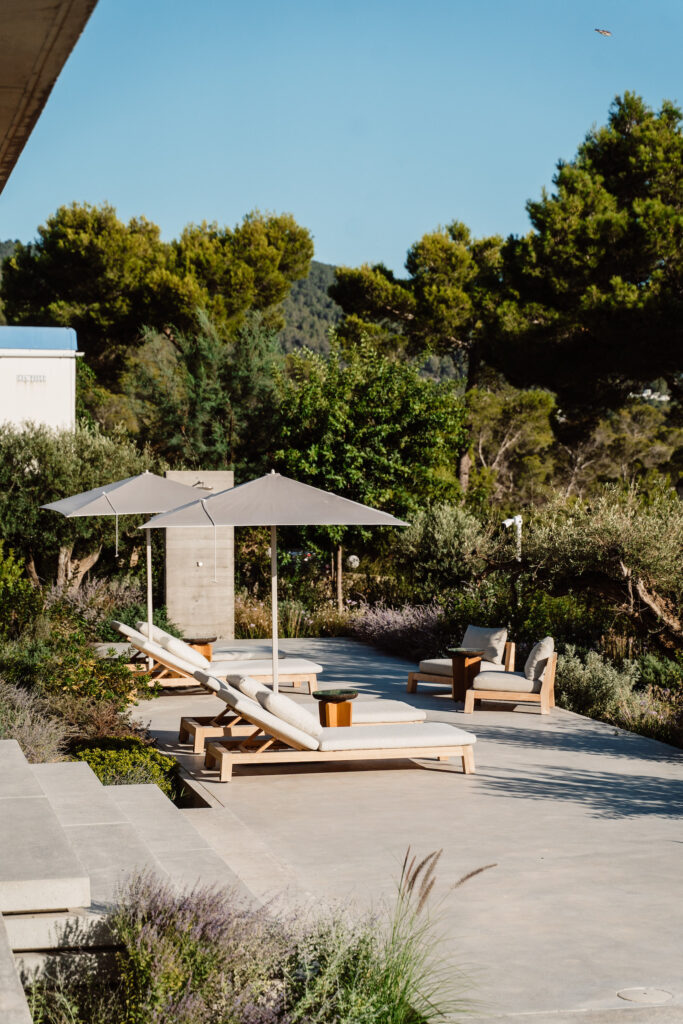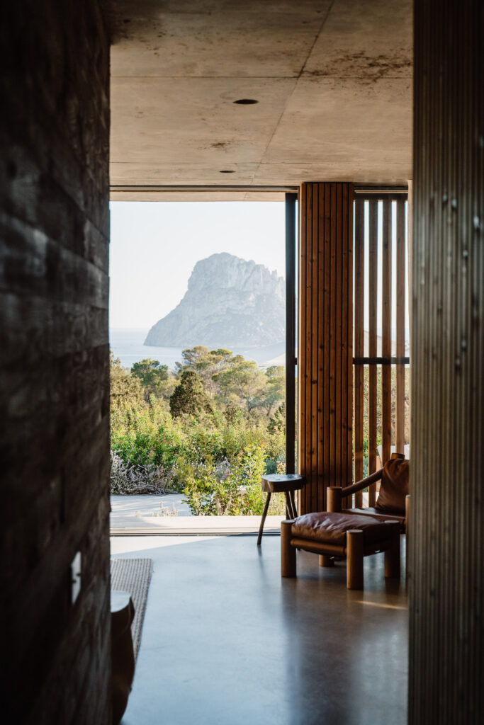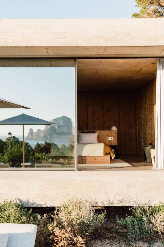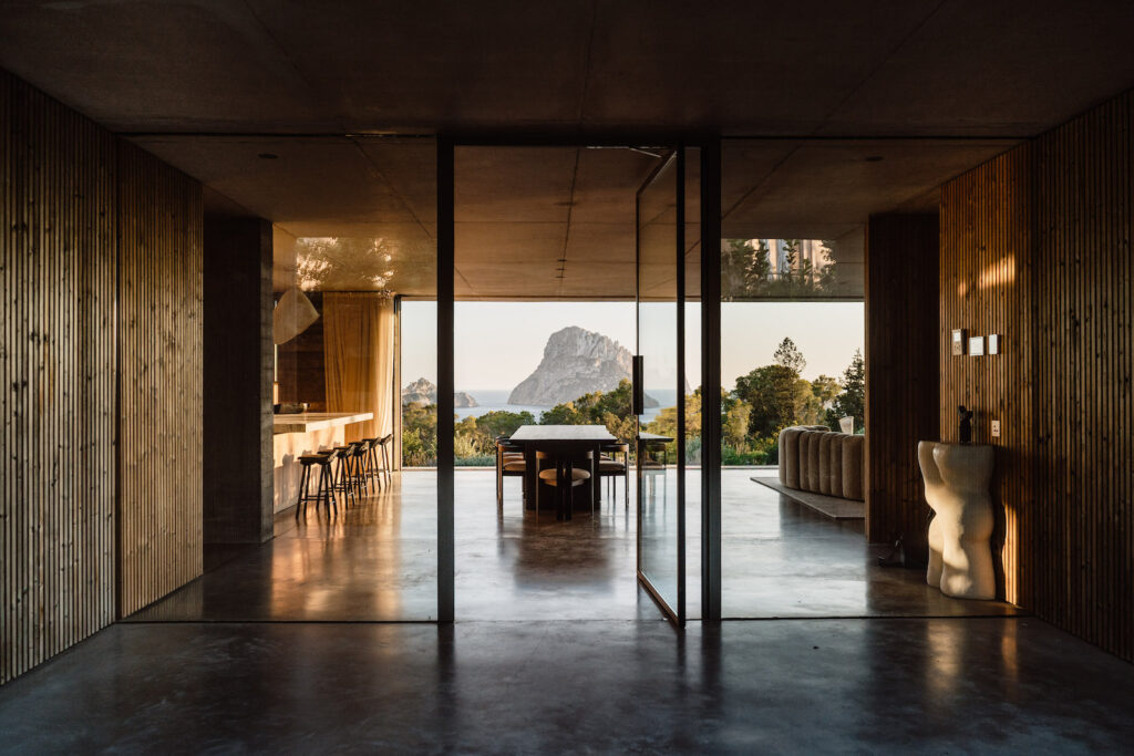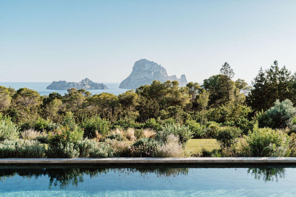 On entering the property, guests are welcomed into the main living area with floor to ceiling windows which showcase unparalleled views over the Mediterranean gardens to open sea views and the mythical Es Vedra. Natural colours of stone and wood, create a cool, calming ambience and chic, sumptuous furniture makes a cosy space. Off the living area is a functional study for those needing to stay connected while away and a cinema room. High speed internet comes as standard, of course. The kitchen is fitted with SMEG appliances and opens out onto a large shaded dining area that overlooks the pool.