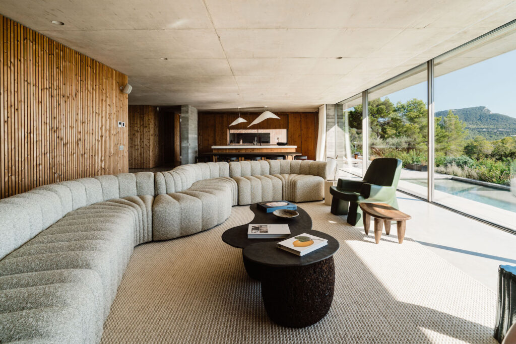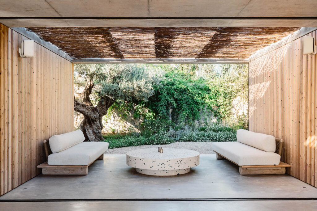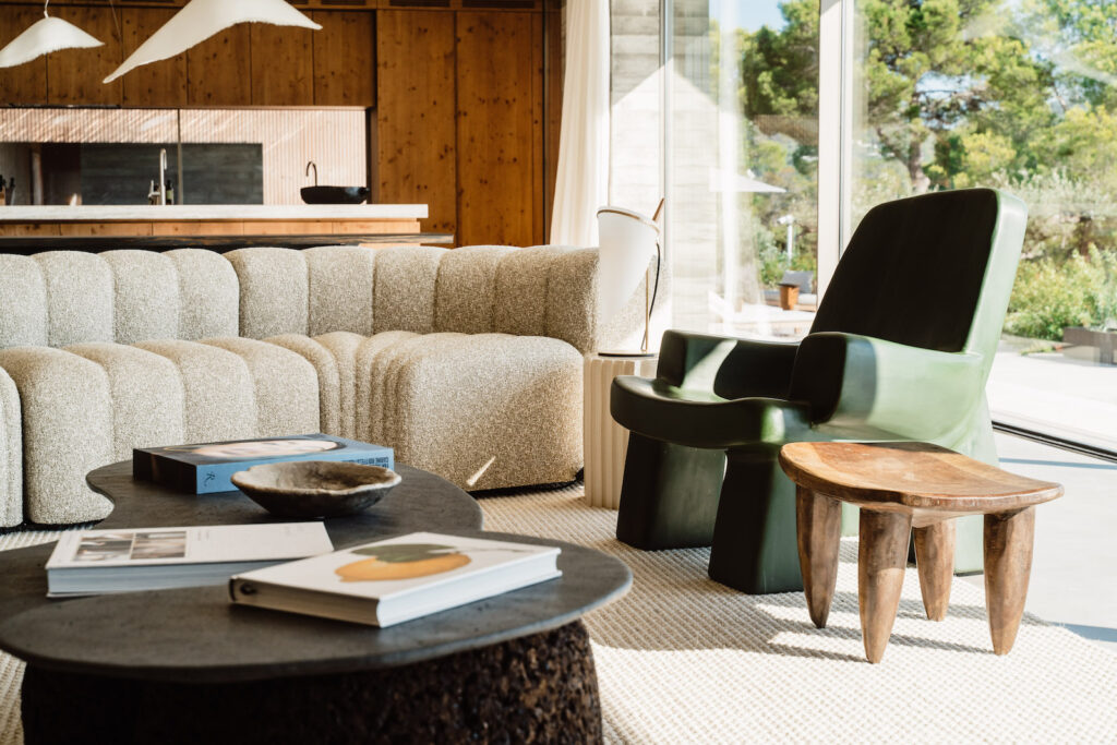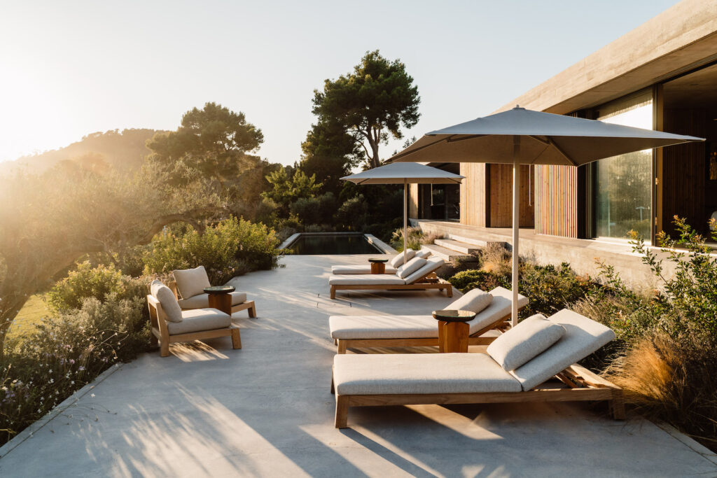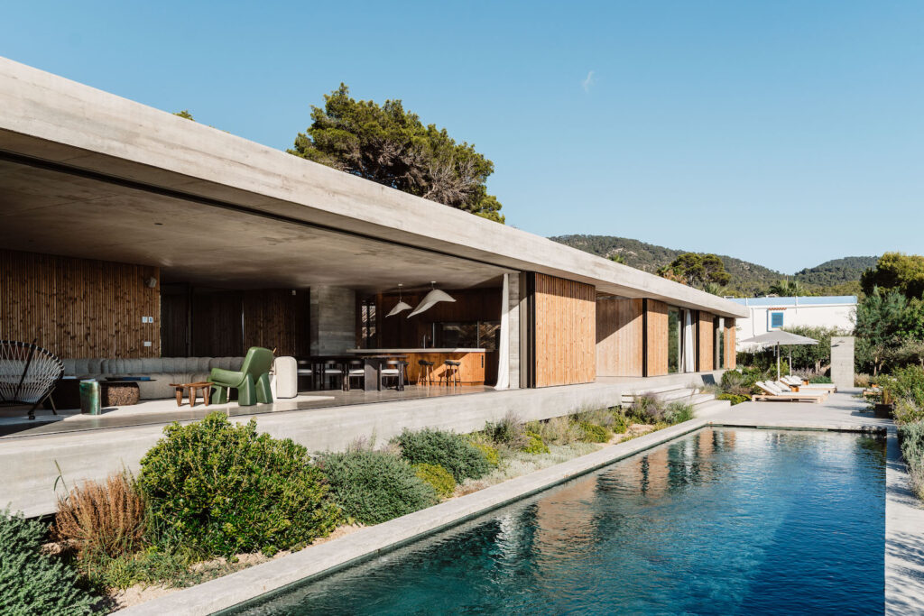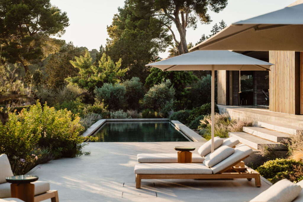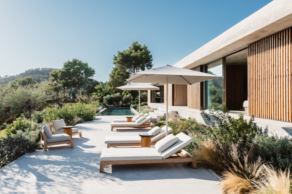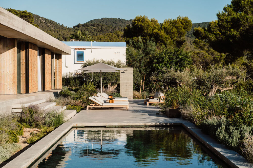 On entering the property, guests are welcomed into the main living area with floor to ceiling windows which showcase unparalleled views over the Mediterranean gardens to open sea views and the mythical Es Vedra. Natural colours of stone and wood, create a cool, calming ambience and chic, sumptuous furniture makes a cosy space. Off the living area is a functional study for those needing to stay connected while away and a cinema room. High speed internet comes as standard, of course. The kitchen is fitted with SMEG appliances and opens out onto a large shaded dining area that overlooks the pool.